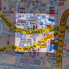This grid includes Clasketgate, Silver Street, Lincoln Theatre Royal, St Peter at Arches and a section of the High Street....